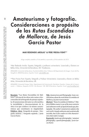 32 Arolas, Mar Redondo & Font, Pere Freixa (2013) “Amateurismo y fotografía. Consideraciones a propósito de las Rutas Escondidas de Mallorca, de Jesús García Pastor.” Revista :Estúdio, Artistas sobre outras Obras. ISSN 1647-6158, e-ISSN 1647-7316. Vol. 4 (8): 32-41.