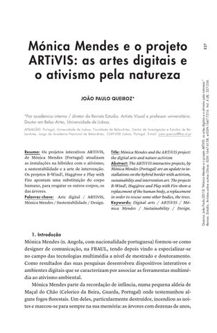 327 Queiroz, João Paulo (2013) “Mónica Mendes e o projeto ARTiVIS: as artes digitais e o ativismo pela natureza.” Revista :Estúdio, Artistas sobre outras Obras. ISSN 1647-6158, e-ISSN 1647-7316. Vol. 4 (8): 327-334.