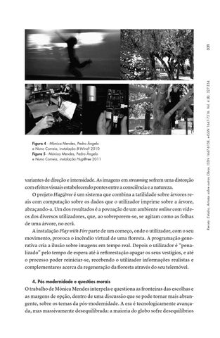 variantes de direção e intensidade. As imagens em streaming sofrem uma distorção com efeitos visuais estabelecendo pontes entre a consciência e a natureza. O projeto Hug@ree é um sistema que combina a tatilidade sobre árvores reais com computação sobre os dados que o utilizador imprime sobre a árvore, abraçando-a. Um dos resultados é a povoação de um ambiente online com vídeos dos diversos utilizadores, que, ao sobreporem-se, se agitam como as folhas de uma árvore, no ecrã. A instalação Play with Fire parte de um começo, onde o utilizador, com o seu movimento, provoca o incêndio virtual de uma floresta. A programação generativa cria a ilusão sobre imagens em tempo real. Depois o utilizador é “penalizado” pelo tempo de espera até à reflorestação apagar os seus vestígios, e até o processo poder reiniciar-se, recebendo o utilizador informações realistas e complementares acerca da regeneração da floresta através do seu telemóvel. 4. Pós modernidade e questões morais