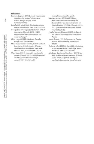 incomplete-manifesto-for-growth Mendes, Mónica (2012) ARTiVIS Arts, Real-Time Video and Interactivity for Sustainability. Tese de doutoramento em Media Digitais, FCT/UNL. [Consult. 201310-21] Disponível em http://hdl.handle. net/10362/9752 Noelle-Neuman, Elizabeth (1995) La Espiral do Silencio: opinião pública. Barcelona: Paidós. Laurel, Brenda (1991) Computers as Theatre. Boston: Addison-Wesley. ISBN 0-20155060-1 Thakara, John (2005) In the Bubble: Designing in a Complex World. Cambridge, Mass.: MIT Press. ISBN 0-262-20157-7 Utterback, Camille; Achituv, Romy (2009) Text Rain. Instalação video interativa. [Consult. 2013-10-22] Disponível em http:// camilleutterback.com/projects/text-rain/