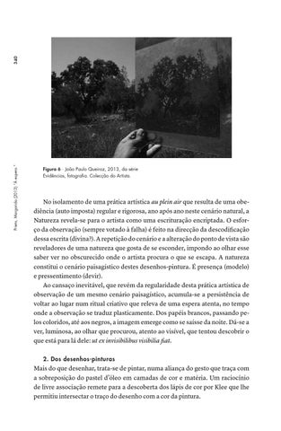 No isolamento de uma prática artística au plein air que resulta de uma obediência (auto imposta) regular e rigorosa, ano após ano neste cenário natural, a Natureza revela-se para o artista como uma escrituração encriptada. O esforço da observação (sempre votado à falha) é feito na direcção da descodificação dessa escrita (divina?). A repetição do cenário e a alteração do ponto de vista são reveladores de uma natureza que gosta de se esconder, impondo ao olhar esse saber ver no obscurecido onde o artista procura o que se escapa. A natureza constitui o cenário paisagístico destes desenhos-pintura. É presença (modelo) e pressentimento (devir). Ao cansaço inevitável, que revém da regularidade desta prática artística de observação de um mesmo cenário paisagístico, acumula-se a persistência de voltar ao lugar num ritual criativo que releva de uma espera atenta, no tempo onde a observação se traduz plasticamente. Dos papéis brancos, passando pelos coloridos, até aos negros, a imagem emerge como se saísse da noite. Dá-se a ver, luminosa, ao olhar que procurou, atento ao visível, que tentou descobrir o que está para lá dele: ut ex invisibilibus visibilia fiat. 2. Dos desenhos-pinturas
