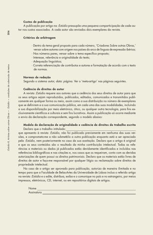 Custos de publicação A publicação por artigo na :Estúdio pressupõe uma pequena comparticipação de cada autor nos custos associados. A cada autor são enviados dois exemplares da revista.