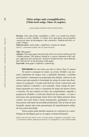 Title: Meta-paper Abstract: This meta-paper describes the style to be used in articles for the :Estúdio journal. The abstract should be a concise statement of the subject, approach and conclusions. Abstracts should not have more than five lines and must be in the first page of the paper. Keywords: meta-paper, conference, referencing.