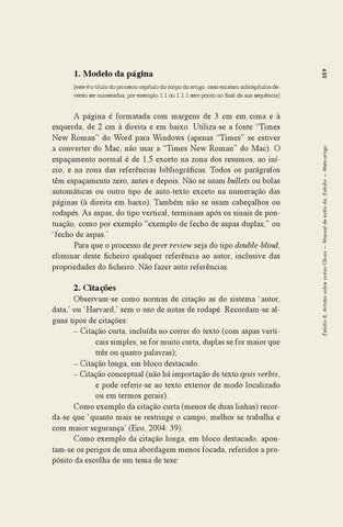 Observam-se como normas de citação as do sistema ‘autor, data,’ ou ‘Harvard,’ sem o uso de notas de rodapé. Recordam-se alguns tipos de citações: – Citação curta, incluída no correr do texto (com aspas verticais simples, se for muito curta, duplas se for maior que três ou quatro palavras); – Citação longa, em bloco destacado. – Citação conceptual (não há importação de texto ipsis verbis, e pode referir-se ao texto exterior de modo localizado ou em termos gerais). Como exemplo da citação curta (menos de duas linhas) recorda-se que ‘quanto mais se restringe o campo, melhor se trabalha e com maior segurança’ (Eco, 2004: 39). Como exemplo da citação longa, em bloco destacado, apontam-se os perigos de uma abordagem menos focada, referidos a propósito da escolha de um tema de tese: