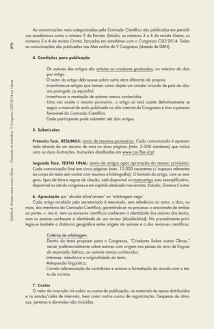 As comunicações mais categorizadas pela Comissão Científica são publicadas em periódicos académicos como o número 9 da Revista :Estúdio, os números 3 e 4 da revista Gama, os números 3 e 4 da revista Croma, lançadas em simultâneo com o Congresso CSO’2014. Todas as comunicações são publicadas nas Atas online do V Congresso (dotada de ISBN). 4. Condições para publicação · Os autores dos artigos são artistas ou criadores graduados, no máximo de dois por artigo. · O autor do artigo debruça-se sobre outra obra diferente da própria. · Incentivam-se artigos que tomam como objeto um criador oriundo de país de idioma português ou espanhol. · Incentiva-se a revelação de autores menos conhecidos. · Uma vez aceite o resumo provisório, o artigo só será aceite definitivamente se seguir o manual de estilo publicado no sítio internet do Congresso e tiver o parecer favorável da Comissão Científica. · Cada participante pode submeter até dois artigos. 5. Submissões Primeira fase, RESUMOS: envio de resumos provisórios. Cada comunicação é apresentada através de um resumo de uma ou duas páginas (máx. 2.000 carateres) que inclua uma ou duas ilustrações. Instruções detalhadas em www.cso.fba.ul.pt Segunda fase, TEXTO FINAL: envio de artigos após aprovação do resumo provisório. Cada comunicação final tem cinco páginas (máx. 10.000 caracteres c/ espaços referentes ao corpo do texto sem contar com resumos e bibliografia). O formato do artigo, com as margens, tipos de letra e regras de citação, está disponível no meta-artigo auto exemplificativo, disponível no site do congresso e em capítulo dedicado nas revistas :Estúdio, Gama e Croma. 6. Apreciação por ‘double blind review’ ou ‘arbitragem cega.’ Cada artigo recebido pelo secretariado é reenviado, sem referência ao autor, a dois, ou mais, dos membros da Comissão Científica, garantindo-se no processo o anonimato de ambas as partes — isto é, nem os revisores científicos conhecem a identidade dos autores dos textos, nem os autores conhecem a identidade do seu revisor (double-blind). No procedimento privilegia-se também a distância geográfica entre origem de autores e a dos revisores científicos. Critérios de arbitragem: · Dentro do tema proposto para o Congresso, “Criadores Sobre outras Obras,” versar preferencialmente sobre autores com origem nos países do arco de línguas de expressão ibérica, ou autores menos conhecidos; · Interesse, relevância e originalidade do texto; · Adequação linguística; · Correta referenciação de contributos e autores e formatação de acordo com o texto de normas. 7. Custos O valor da inscrição irá cobrir os custos de publicação, os materiais de apoio distribuídos e os snacks/cafés de intervalo, bem como outros custos de organização. Despesas de almoços, jantares e dormidas não incluídas.