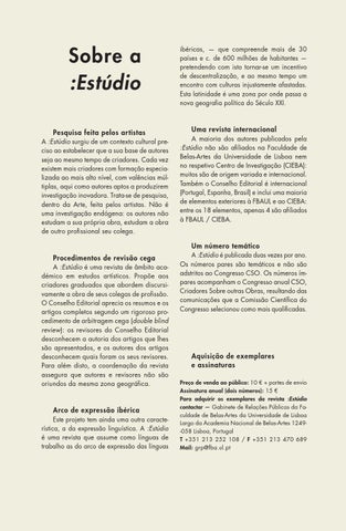 Uma revista internacional A maioria dos autores publicados pela :Estúdio não são afiliados na Faculdade de Belas-Artes da Universidade de Lisboa nem no respetivo Centro de Investigação (CIEBA): muitos são de origem variada e internacional. Também o Conselho Editorial é internacional (Portugal, Espanha, Brasil) e inclui uma maioria de elementos exteriores à FBAUL e ao CIEBA: entre os 18 elementos, apenas 4 são afiliados à FBAUL / CIEBA.