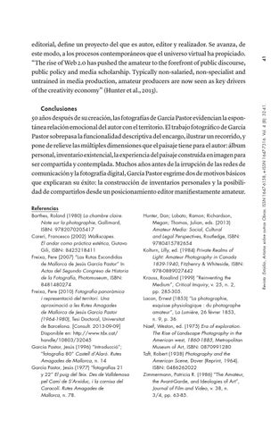 50 años después de su creación, las fotografías de García Pastor evidencian la espontánea relación emocional del autor con el territorio. El trabajo fotográfico de García Pastor sobrepasa la funcionalidad descriptiva del encargo, ilustrar un recorrido, y pone de relieve las múltiples dimensiones que el paisaje tiene para el autor: álbum personal, inventario existencial, la experiencia del paisaje construida en imagen para ser compartida y contemplada. Muchos años antes de la irrupción de las redes de comunicación y la fotografía digital, García Pastor esgrime dos de motivos básicos que explicaran su éxito: la construcción de inventarios personales y la posibilidad de compartirlos desde un posicionamiento editor manifiestamente amateur. Referencias Barthes, Roland (1980) La chambre claire. Note sur la photographie, Gallimard, ISBN: 9782070205417 Careri, Francesco (2002) Walkscapes. El andar como práctica estética, Gutavo Gili, ISBN: 8425218411 Freixa, Pere (2007) “Las Rutas Escondidas de Mallorca de Jesús García Pastor” In Actas del Segundo Congreso de Historia de la Fotografía, Photomuseum, ISBN: 8481480274 Freixa, Pere (2010) Fotografia panoràmica i representació del territori. Una aproximació a les Rutes Amagades de Mallorca de Jesús García Pastor (1964-1980), Tesi Doctoral, Universitat de Barcelona. [Consult. 2013-09-09] Disponible en: http://www.tdx.cat/ handle/10803/32045 García Pastor, Jesús (1996) “Introducció”; “fotografia 80” Castell d’Alaró. Rutes Amagades de Mallorca, n. 14 García Pastor, Jesús (1977) “fotografías 21 y 22” El puig del Teix. Des de Valldemosa pel Camí de S’Arxiduc, i la cornisa del Caracolí. Rutes Amagades de Mallorca, n. 78.