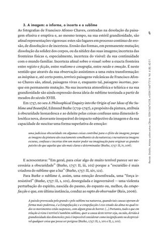 As fotografias de Francisco Afonso Chaves, centradas na desolação da paisagem efusiva e eruptiva e, ao mesmo tempo, na sua estéril grandiosidade, são afinal representações vigorosas: estes são lugares em processo contínuo de erosão, de dissolução e de incerteza. Erosão das formas, em permanente mutação; dissolução da solidez dos corpos, ou da nitidez das suas imagens; incerteza das fronteiras físicas e, especialmente, incerteza do visível: da sua continuidade com o mundo familiar. Incerteza afinal sobre o visual: sobre a exacta fronteira entre registo e ficção, entre realismo e cenografia, entre razão e emoção. É neste sentido que através da sua observação assistimos a uma outra transformação: as inóspitas e, até certo ponto, terríveis paisagens vulcânicas de Francisco Afonso Chaves são, afinal, paisagens vivas e, enquanto tal, paisagens incertas, porque em permanente mutação. Na sua incerteza atmosférica e telúrica e na sua grandiosidade são ainda expressão dessa ideia de sublime teorizada a partir de meados do século XVIII. Em 1757, no seu A Philosophical Enquiry into the Origin of our Ideas of the Sublime and Beautiful, Edmund Burke (1729-1797), a propósito da pintura, atribuía à obscuridade leonardesca e ao deleite pelas coisas confusas uma dimensão filosófica nova, doravante inseparável do impacto subjectivo da imagem e da sua capacidade de suscitar uma forma superlativa de emoção:
