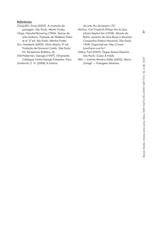 da arte. Rio de Janeiro: LTC. Martius, Carl Friedrich Philipp Von & Spix, Johann Baptist Von (1938). Através da Bahia: excertos da obra Reise in Brasilien. Companhia Editora Nacional, São Paulo, 1938. Disponível em: http://www. brasiliana.com.br/ Valéry, Paul (2003). Degas Dança Desenho. São Paulo: Cosac & Naify. IMS — Instituto Moreira Salles (2002). Mario Zavagli — Paisagens Mineiras.