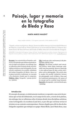 58 Mallent, Marta Marco (2013) “Paisaje, lugar y memoria en la fotografía de Bleda y Rosa.” Revista :Estúdio, Artistas sobre outras Obras. ISSN 1647-6158, e-ISSN 1647-7316. Vol. 4 (8): 58-63.