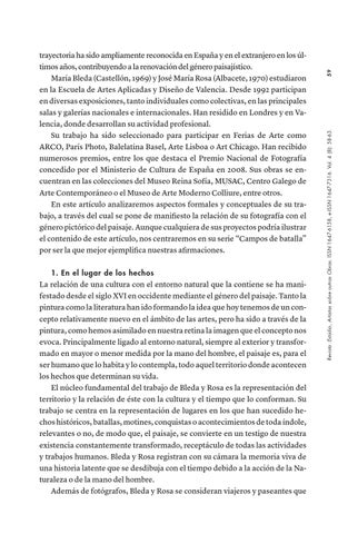 trayectoria ha sido ampliamente reconocida en España y en el extranjero en los últimos años, contribuyendo a la renovación del género paisajístico. María Bleda (Castellón, 1969) y José María Rosa (Albacete, 1970) estudiaron en la Escuela de Artes Aplicadas y Diseño de Valencia. Desde 1992 participan en diversas exposiciones, tanto individuales como colectivas, en las principales salas y galerías nacionales e internacionales. Han residido en Londres y en Valencia, donde desarrollan su actividad profesional. Su trabajo ha sido seleccionado para participar en Ferias de Arte como ARCO, París Photo, Balelatina Basel, Arte Lisboa o Art Chicago. Han recibido numerosos premios, entre los que destaca el Premio Nacional de Fotografía concedido por el Ministerio de Cultura de España en 2008. Sus obras se encuentran en las colecciones del Museo Reina Sofía, MUSAC, Centro Galego de Arte Contemporáneo o el Museo de Arte Moderno Colliure, entre otros. En este artículo analizaremos aspectos formales y conceptuales de su trabajo, a través del cual se pone de manifiesto la relación de su fotografía con el género pictórico del paisaje. Aunque cualquiera de sus proyectos podría ilustrar el contenido de este artículo, nos centraremos en su serie “Campos de batalla” por ser la que mejor ejemplifica nuestras afirmaciones.