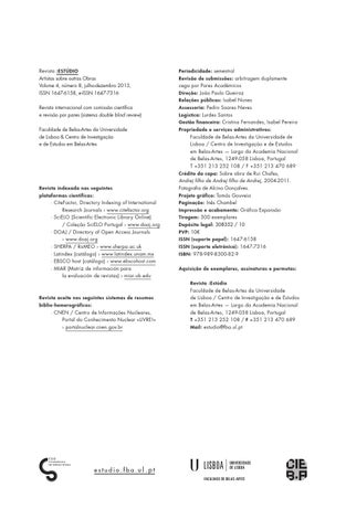 Periodicidade: semestral Revisão de submissões: arbitragem duplamente cega por Pares Académicos Direção: João Paulo Queiroz Relações públicas: Isabel Nunes Assessoria: Pedro Soares Neves Logística: Lurdes Santos Gestão financeira: Cristina Fernandes, Isabel Pereira Propriedade e ser viços administrativos: Faculdade de Belas-Artes da Universidade de Lisboa / Centro de Investigação e de Estudos em Belas-Artes — Largo da Academia Nacional de Belas-Artes, 1249-058 Lisboa, Portugal T +351 213 252 108 / F +351 213 470 689 Crédito da capa: Sobre obra de Rui Chafes, Andrej filho de Andrej filho de Andrej, 2004-2011. Fotografia de Alcino Gonçalves. Projeto gráfico: Tomás Gouveia Paginação: Inês Chambel Impressão e acabamento: Gráfica Expansão Tiragem: 500 exemplares Depósito legal: 308352 / 10 PVP: 10€ ISSN (suporte papel): 1647-6158 ISSN (suporte eletrónico): 1647-7316 ISBN: 978-989-8300-82-9 Aquisição de exemplares, assinaturas e permutas: Revista :Estúdio Faculdade de Belas-Artes da Universidade de Lisboa / Centro de Investigação e de Estudos em Belas-Artes — Largo da Academia Nacional de Belas-Artes, 1249-058 Lisboa, Portugal T +351 213 252 108 / F +351 213 470 689 Mail: estudio@fba.ul.pt