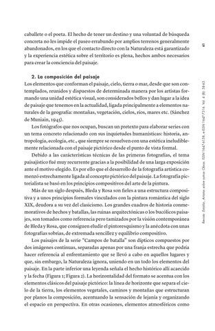 2. La composición del paisaje Los elementos que conforman el paisaje, cielo, tierra o mar, desde que son contemplados, reunidos y dispuestos de determinada manera por los artistas formando una unidad estética visual, son considerados bellos y dan lugar a la idea de paisaje que tenemos en la actualidad, ligada principalmente a elementos naturales de la geografía: montañas, vegetación, cielos, ríos, mares etc. (Sánchez de Muniain, 1945). Los fotógrafos que nos ocupan, buscan un pretexto para elaborar series con un tema concreto relacionado con sus inquietudes humanísticas: historia, antropología, ecología, etc., que siempre se resuelven con una estética ineludiblemente relacionada con el paisaje pictórico desde el punto de vista formal. Debido a las carácterísticas técnicas de las primeras fotografías, el tema paisajístico fué muy recurrente gracias a la posibilidad de una larga exposición ante el motivo elegido. Es por ello que el desarrollo de la fotografía artística comenzó estrechamente ligada al concepto pictórico del paisaje. La fotografía pictorialista se basó en los principios compositivos del arte de la pintura. Más de un siglo después, Bleda y Rosa son fieles a una estructura compositiva y a unos principios formales vinculados con la pintura romántica del siglo XIX, deudora a su vez del clasicismo. Los grandes cuadros de historia conmemorativos de hechos y batallas, las ruinas arquitectónicas o los bucólicos paisajes, son tomados como referencia pero tamizados por la visión contemporánea de Bleda y Rosa, que consiguen eludir el pintoresquismo y la anécdota con unas fotografías sobrias, de extremada sencillez y equilibrio compositivo. Los paisajes de la serie “Campos de batalla” son dípticos compuestos por dos imágenes contínuas, separadas apenas por una franja estrecha que podría hacer referencia al enfrentamiento que se llevó a cabo en aquellos lugares y que, sin embargo, la Naturaleza ignora, uniendo en un todo los elementos del paisaje. En la parte inferior una leyenda señala el hecho histórico allí acaecido y la fecha (Figura 1; Figura 2). La horizontalidad del formato se acentua con los elementos clásicos del paisaje pictórico: la línea de horizonte que separa el cielo de la tierra, los elementos vegetales, caminos y montañas que estructuran por planos la composición, acentuando la sensación de lejanía y organizando el espacio en perspectiva. En otras ocasiones, elementos atmosféricos como