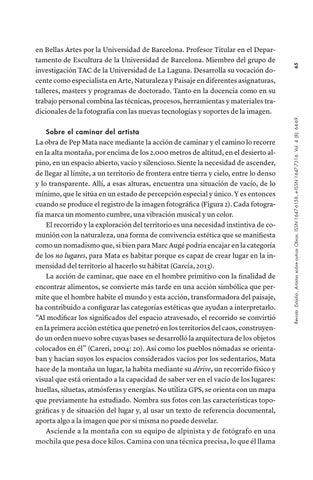 Sobre el caminar del artista La obra de Pep Mata nace mediante la acción de caminar y el camino lo recorre en la alta montaña, por encima de los 2.000 metros de altitud, en el desierto alpino, en un espacio abierto, vacío y silencioso. Siente la necesidad de ascender, de llegar al límite, a un territorio de frontera entre tierra y cielo, entre lo denso y lo transparente. Allí, a esas alturas, encuentra una situación de vacío, de lo mínimo, que le sitúa en un estado de percepción especial y único. Y es entonces cuando se produce el registro de la imagen fotográfica (Figura 2). Cada fotografía marca un momento cumbre, una vibración musical y un color. El recorrido y la exploración del territorio es una necesidad instintiva de comunión con la naturaleza, una forma de convivencia estética que se manifiesta como un nomadismo que, si bien para Marc Augé podría encajar en la categoría de los no lugares, para Mata es habitar porque es capaz de crear lugar en la inmensidad del territorio al hacerlo su hábitat (García, 2013). La acción de caminar, que nace en el hombre primitivo con la finalidad de encontrar alimentos, se convierte más tarde en una acción simbólica que permite que el hombre habite el mundo y esta acción, transformadora del paisaje, ha contribuido a configurar las categorías estéticas que ayudan a interpretarlo. “Al modificar los significados del espacio atravesado, el recorrido se convirtió en la primera acción estética que penetró en los territorios del caos, construyendo un orden nuevo sobre cuyas bases se desarrolló la arquitectura de los objetos colocados en él” (Careri, 2004: 20). Así como los pueblos nómadas se orientaban y hacían suyos los espacios considerados vacíos por los sedentarios, Mata hace de la montaña un lugar, la habita mediante su dérive, un recorrido físico y visual que está orientado a la capacidad de saber ver en el vacío de los lugares: huellas, siluetas, atmósferas y energías. No utiliza GPS, se orienta con un mapa que previamente ha estudiado. Nombra sus fotos con las características topográficas y de situación del lugar y, al usar un texto de referencia documental, aporta algo a la imagen que por sí misma no puede desvelar. Asciende a la montaña con su equipo de alpinista y de fotógrafo en una mochila que pesa doce kilos. Camina con una técnica precisa, lo que él llama