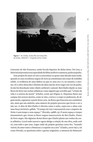 Convento de São Francisco, então Escola Superior de Belas-Artes. Por isso, a ideia inicial possuía essa capacidade de diluir artifício e natureza, pedra na pedra. Este projeto de amor só veio a concretizar-se quase uma década mais tarde, quando as suas esculturas negras de ferro já constituíam um corpo de trabalho sólido. A evidência de uma dádiva ao que se ama era e é, no entanto, a mesma. Só a obra oferecida é distinta da ideia inicial, ferro negro em vez de pedra. Já não há dissolução entre objeto artificial e natural. Rui Chafes depõe as suas flores de ferro nas rochas atlânticas como alguém que acredita que “a fonte da vida é a certeza da morte” (Chafes, 2006, 95) (Figura 1). Depomos flores nas campas dos nossos mortos, como se elas, a terra e o corpo se pudessem, de algum modo, regenerar a partir desse acto. As flores que fenecem nos cemitérios são, mais que um símbolo, uma mimesis do próprio processo que levou o ser a não ser. A obra de Rui Chafes é obscura como a noite, sopra-nos a alma com uma força invisível e gélida. “O tempo da Luz é mensurável; mas o império da Noite é sem tempo e sem espaço.” (Novalis, 1988b: 25). É neste espaço e tempo imensuráveis que vivem as flores negras imarcescíveis de Rui Chafes. Flores de ferro negro. São algumas destas flores que Chafes planta nas rochas da costa atlântica. Local onde nasceu e agora abriga a criação da sua obra, onde está só, com tudo o que ama. Lugar onde ele próprio germina como Ser, “tornado visível, do amor entre a Natureza e o espírito ou a arte” (Chafes, 2000: 85) e, tal como Novalis, se questiona sobre o germe originário, a natureza da Natureza?