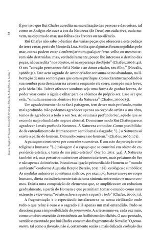 É por isso que Rui Chafes acredita na sacralização das pessoas e das coisas, tal como os Antigos ele ouve a voz da Natureza (de Deus) em cada erva, cada nuvem, na espuma do mar, nas folhas das árvores ou no silêncio. Rui Chafes não sabe o destino das várias peças que ofereceu a este pedaço de terra e mar, perto do Monte da Lua. Sonha que algumas foram engolidas pelo mar, outras podem estar a enferrujar num qualquer ferro-velho ou mesmo terem sido destruídas, mas, verdadeiramente, pouco lhe interessa o destino das peças, não acredita “nos objetos, só na esperança do objeto” (Chafes, 2006: 41). O seu “coração permanece fiel à Noite e ao Amor criador, seu filho.” (Novalis, 1988b: 31). Este acto sagrado de Amor criador consuma-se no abandono, na libertação de uma sombra para que esta se purifique. Como Zaratustra pedindo à sua sombra para descansar na caverna enquanto ele corre, com pés mais leves, pelo Meio-Dia. Talvez oferecer sombras seja uma forma de ganhar leveza, de poder voar como a águia e olhar para os abismos do próprio ser. Esse ser que está, “simultaneamente, dentro e fora da Natureza” (Chafes, 2000: 85). Um agradecimento não se faz à paisagem, tem de ser mais profundo, muito mais profundo. Não podemos agradecer apenas ao corpo do artista a sua obra, temos de agradecer a todo o seu Ser. Ao seu mais profundo Ser, aquele que se esconde na profundidade negra e abismal. Do mesmo modo Rui Chafes parece agradecer à mais profunda Natureza. À Natureza como Ser. Como possibilidade de entendimento do Humano num sentido mais alargado: “(…) a Natureza só existe a partir do homem. O mundo começa no homem.” (Chafes, 2006: 171). A paisagem constrói-se por conexões sucessivas. É um acto da perceção e inteligência humana: “(…) paisagem é o espaço que se constitui em objeto de experiência estética, e tema de um juízo estético” (Serrão, 2011: 341). A Natureza também o é, mas possui os misteriosos abismos interiores, mais próximos do Ser e não apenas do intelecto. Possui essa ligação primordial do Homem ao “mundo ambiente” conforme Augustin Berque (Serrão, 2011: 188), ecológica e simbólica: As medidas anteriores ao sistema métrico, por exemplo, baseavam-se no corpo humano, direta ou indiretamente existia uma sintonia entre micro e macro cosmos. Existia uma composição de elementos que, se amplificavam ou reduziam gradualmente, a partir do Homem e que permitiam tomar o mundo como uma extensão e vice-versa: “o todo esclarece a parte e a parte o todo” (Chafes, 2000: 71). A fragmentação e o espectáculo instalaram-se na nossa civilização onde tudo o que reluz é ouro e o sagrado é já apenas um mal entendido. Tudo se direciona para a impossibilidade do pensamento. A arte assume-se, cada vez mais, como um duro exercício de resistência ao facilitismo dos clichés. O acto pensado, sentido e executado por Rui Chafes ecoa um dos fragmentos de Novalis: “O pensamento, tal como a floração, não é, certamente senão a mais delicada evolução das