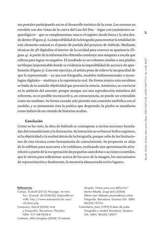 sus postales participando así en el desarrollo turístico de la zona. Las escenas en cuestión son dos vistas de la cueva del Cau del Duc —lugar con yacimientos arqueológicos— que se complementan: una es el registro desde fuera y la otra desde dentro (Figura 3). La imposibilidad de la fotografía para mostrar la totalidad de este elemento natural es el punto de partida del proyecto de Subirah. Mediante técnicas de 3D digitaliza el interior de la cavidad para conocer su apariencia (Figura 4). A partir de la información obtenida construye una maqueta a escala que rellena para lograr su negativo. El resultado es un volumen similar a una piedra: un bloque impermeable donde se evidencia la imposibilidad de acceso y de aprehensión (Figura 5). Con este ejercicio, el artista pone de relieve la incapacidad de que lo representado —ya sea con fotografía, modelos tridimensionales o tecnologías digitales— sustituya a la experiencia real. De forma irónica esta escultura se burla de la ansiada objetividad que procura la ciencia. Asimismo, se convierte en la antítesis del souvenir, porque aunque sea una reproducción mimética del referente, no es posible reconocerlo y, en consecuencia, no puede ser entendido como un sustituto. Su forma cerrada solo permite una conexión simbólica con el modelo, y es justamente ésta la poética que desprende: la piedra se manifiesta como indicio de un cúmulo de historias ocultas. Conclusión Como se ha visto, la obra de Subirah se contrapone a ciertas nociones heredadas del romanticismo y la ilustración. Su intención no es buscar bellos registros, ni la objetividad o la verdad detrás de la fotografía, porque sabe de las limitaciones de esta técnica como herramienta de conocimiento. Su propuesta se aleja de lo sublime para acercarse a lo cotidiano, realizando una aproximación al territorio a partir de la recuperación de pequeñas anécdotas o acciones ocurridas, que le sirven para reflexionar acerca de los usos de la imagen, los mecanismos de representación y finalmente, la memoria almacenada en los lugares.