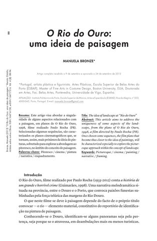 Introdução O Rio do Ouro, filme realizado por Paulo Rocha (1935-2012) conta a história de um grande e horrível crime (Guimarães, 1998). Uma narrativa melodramática situada na província, entre o Douro e o Porto, que convoca paixões funestas sublinhadas pela força telúrica das margens do Rio Douro. O que neste filme se deve à paisagem depende do facto de o próprio título convocar — o rio — elemento material, constitutivo do reportório de identificação na pintura de paisagem. Conhecendo-se o Douro, identificam-se alguns panoramas seja pela pertença, seja porque se o atravessa, em deambulações mais ou menos turísticas.