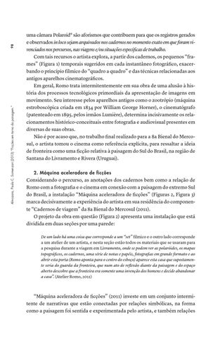 uma câmara Polaroid® são aforismos que contribuem para que os registros gerados e observados in loco sejam arquivados nos cadernos no momento exato em que foram vivenciados nos percursos, nas viagens e/ou situações específicas de trabalho. Com tais recursos o artista explora, a partir dos cadernos, os pequenos “frames” (Figura 1) temporais sugeridos em cada instantâneo fotográfico, exacerbando o princípio fílmico do “quadro a quadro” e das técnicas relacionadas aos antigos aparelhos cinematográficos. Em geral, Romo trata intermitentemente em sua obra de uma alusão à história dos processos tecnológicos primordiais da apresentação de imagens em movimento. Seu interesse pelos aparelhos antigos como o zootrópio (máquina estroboscópica criada em 1834 por William George Horner), o cinematógrafo (patenteado em 1895, pelos irmãos Lumière), determina incisivamente os relacionamentos histórico-conceituais entre fotografia e audiovisual presentes em diversas de suas obras. Não é por acaso que, no trabalho final realizado para a 8a Bienal do Mercosul, o artista tomou o cinema como referência explícita, para ressaltar a ideia de fronteira como uma ficção relativa à paisagem do Sul do Brasil, na região de Santana do Livramento e Rivera (Uruguai). 2. Máquina aceleradora de ficções