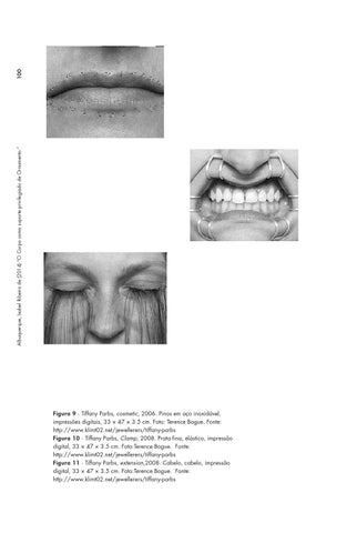 Figura 9 ∙ Tiffany Parbs, cosmetic, 2006. Pinos em aço inoxidável, impressões digitais, 33 × 47 × 3.5 cm. Foto: Terence Bogue. Fonte: http://www.klimt02.net/jewellerers/tiffany-parbs Figura 10 ∙ Tiffany Parbs, Clamp, 2008. Prata fina, elástico, impressão digital, 33 × 47 × 3.5 cm. Foto:Terence Bogue. Fonte: http://www.klimt02.net/jewellerers/tiffany-parbs Figura 11 ∙ Tiffany Parbs, extension,2008. Cabelo, cabelo, impressão digital, 33 × 47 × 3.5 cm. Foto:Terence Bogue. Fonte: http://www.klimt02.net/jewellerers/tiffany-parbs