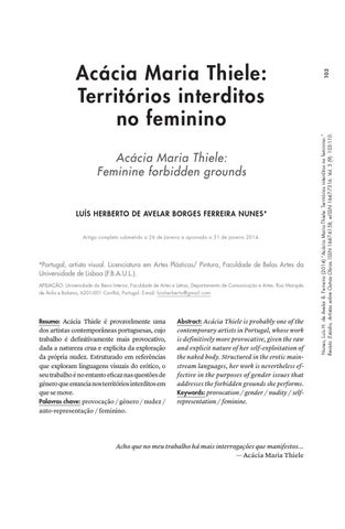 103 Nunes, Luís H. de Avelar B. Ferreira (2014) “Acácia Maria Thiele: Territórios interditos no feminino.” Revista :Estúdio, Artistas sobre Outras Obras. ISSN 1647-6158, e-ISSN 1647-7316. Vol. 5 (9): 103-110.