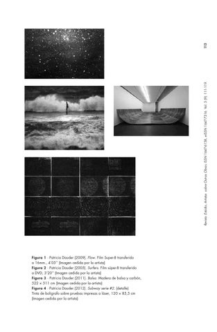 Figura 1 ∙ Patricia Dauder (2009). Flow. Film Super-8 transferido a 16mm., 4’05’’ (Imagen cedida por la artista) Figura 2 ∙ Patricia Dauder (2005). Surfers. Film súper-8 transferido a DVD, 3’20’’ (Imagen cedida por la artista) Figura 3 ∙ Patricia Dauder (2011). Balsa. Madera de balsa y carbón, 522 × 511 cm (Imagen cedida por la artista) Figura 4 ∙ Patricia Dauder (2012). Subway serie #2. (detalle) Tinta de bolígrafo sobre pruebas impresas a láser, 120 × 85,5 cm (Imagen cedida por la artista)