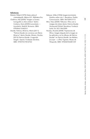 Deleuze, Gilles (1994) Imagen-movimiento. Estudios sobre cine 1. Barcelona: Paidós Comunicación. ISBN: 84-7509-317-5 Miró, Neus (2009) “Dibuixos i films com a imatges de síntesis dentro Patricia Dauder. Horitzontal/Orbital. Barcelona: Fundació Suñol. DL: B-21186-2009 Nicolau, Ricardo (2008) “Impresiones de África. Imagen después de la imagen en las películas y en los dibujos de Patricia Dauder” en Patricia Dauder. Les Maliens (a script — a film). Figueres: Museu de l’Empordà. ISBN: 978-84-934481-8-9