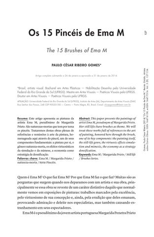 Gomes, Paulo César Ribeiro (2014) “Os 15 Pincéis de Ema M.” Revista :Estúdio, Artistas sobre Outras Obras. ISSN 1647-6158, e-ISSN 1647-7316. Vol. 5 (9): 127-134.