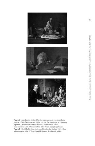 Figura 6 ∙ Jean-Baptiste-Siméon Chardin. Natureza-morta com os atributos da arte, 1766. Óleo sobre tela, 112 × 141 cm. The Hermitage, St. Petersburg. Figura 7 ∙ Jean-Baptiste-Siméon Chardin. Os atributos da Pintura e da Escultura, 1728. Óleo sobre tela, 64 × 92 cm. Coleção particular. Figura 8 ∙ David Bailly. Auto-retrato com Símbolos das Vanitas, 1651. Óleo sobre madeira, 65 × 97,5 cm. Stedelijk Museum de Lakenhal, Leiden.