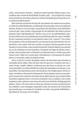 estão, curiosamente ausentes. Ausência notável quando olhamos para o maravilhoso auto-retrato de David Bailly (Leyden, 1584 — 1657) (Figura 8), no qual temos esculturas, desenhos, pinturas e mesmo uma paleta presa à parede e, coisa notável, nenhum pincel! Mas voltemos aos pincéis de Ema M. Seus pincéis são sujeitos da sua pintura: estão sós, individualizados, emoldurados/encaixotados, mas em recipientes abertos, dando-se a ver em toda a sua potência de indivíduos. Jean-Paul Sartre escreveu que “para sonhar a dissociação de um indivíduo [do todo] é preciso primeiro saber individualizá-los” (Sartre, 2014: p.17). Ao individualizar o pincel, Ema M dá a ele sua unicidade que nos permite percebê-los como a totalidade até o momento invisível: eu vejo pincéis, nunca vejo “o pincel”. É no centro da sua pintura, feita exclusivamente com um pincel, que percebemos sua importância e seu caráter vital: não se pinta sem pincel (mesmo quando uso um simulacro ou um símile, estou usando um pincel). O pincel adquire sua essência de ser, de indivíduo na arte da pintura. Conquista seu lugar de direito como a prótese mais próxima que os humanos encontraram para o cérebro que pinta (assim como o lápis ou o carvão para o desenhista); é a ferramenta do obreiro pintor, é a extensão, enfim, do próprio artista. Esses 15 Pincéis, no dizer da própria artista, são descrições que retratam as variedades deste objeto. Mas são bem mais do que isso: os pinceis não são, e nunca foram, simples objetos. Lembremo-nos que lavar os pincéis era a primeira atividade, no rol das infindáveis tarefas dos aprendizes nas oficinas, a ser aprendida. Sua importância estava decretada por este simples gesto: deixar íntegra e incólume a ferramenta/instrumento. Essas pinturas trazem na sua própria economia não somente a descrição desse objeto pincel, mas a própria idéia da pintura enquanto tema e com suas correlações com a erudição, com o tema da pintura sobre a pintura, com o tema do artista em atividade, da linguagem da pintura. Trata-se de uma série de obras que articula um tema excepcional por sua raridade a uma estratégia compositiva culta: um exercício de virtuosismo que permite que a economia do resultado esconda, com grande habilidade, a densidade de seu tema e de seu objeto.
