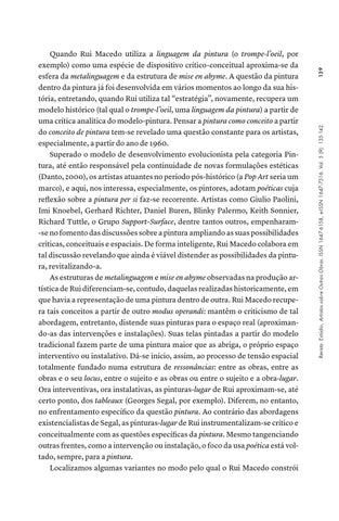 Quando Rui Macedo utiliza a linguagem da pintura (o trompe-l’oeil, por exemplo) como uma espécie de dispositivo crítico-conceitual aproxima-se da esfera da metalinguagem e da estrutura de mise en abyme. A questão da pintura dentro da pintura já foi desenvolvida em vários momentos ao longo da sua história, entretando, quando Rui utiliza tal “estratégia”, novamente, recupera um modelo histórico (tal qual o trompe-l’oeil, uma linguagem da pintura) a partir de uma crítica analítica do modelo-pintura. Pensar a pintura como conceito a partir do conceito de pintura tem-se revelado uma questão constante para os artistas, especialmente, a partir do ano de 1960. Superado o modelo de desenvolvimento evolucionista pela categoria Pintura, até então responsável pela continuidade de novas formulações estéticas (Danto, 2000), os artistas atuantes no período pós-histórico (a Pop Art seria um marco), e aqui, nos interessa, especialmente, os pintores, adotam poéticas cuja reflexão sobre a pintura per si faz-se recorrente. Artistas como Giulio Paolini, Imi Knoebel, Gerhard Richter, Daniel Buren, Blinky Palermo, Keith Sonnier, Richard Tuttle, o Grupo Support-Surface, dentre tantos outros, empenharam-se no fomento das discussões sobre a pintura ampliando as suas possibilidades críticas, conceituais e espaciais. De forma inteligente, Rui Macedo colabora em tal discussão revelando que ainda é viável distender as possibilidades da pintura, revitalizando-a. As estruturas de metalinguagem e mise en abyme observadas na produção artística de Rui diferenciam-se, contudo, daquelas realizadas historicamente, em que havia a representação de uma pintura dentro de outra. Rui Macedo recupera tais conceitos a partir de outro modus operandi: mantêm o criticismo de tal abordagem, entretanto, distende suas pinturas para o espaço real (aproximando-as das intervenções e instalações). Suas telas pintadas a partir do modelo tradicional fazem parte de uma pintura maior que as abriga, o próprio espaço interventivo ou instalativo. Dá-se início, assim, ao processo de tensão espacial totalmente fundado numa estrutura de ressonâncias: entre as obras, entre as obras e o seu locus, entre o sujeito e as obras ou entre o sujeito e a obra-lugar. Ora interventivas, ora instalativas, as pinturas-lugar de Rui aproximam-se, até certo ponto, dos tableaux (Georges Segal, por exemplo). Diferem, no entanto, no enfrentamento específico da questão pintura. Ao contrário das abordagens existencialistas de Segal, as pinturas-lugar de Rui instrumentalizam-se crítico e conceitualmente com as questões específicas da pintura. Mesmo tangenciando outras frentes, como a intervenção ou instalação, o foco da usa poética está voltado, sempre, para a pintura. Localizamos algumas variantes no modo pelo qual o Rui Macedo constrói