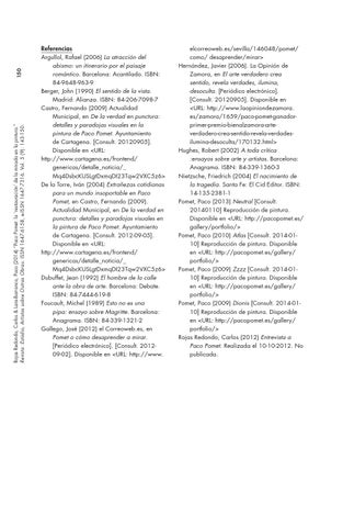 Referencias Argullol, Rafael (2006) La atracción del abismo: un itinerario por el paisaje romántico. Barcelona: Acantilado. ISBN: 84-9648-963-9 Berger, John (1990) El sentido de la vista. Madrid: Alianza. ISBN: 84-206-7098-7 Castro, Fernando (2009) Actualidad Municipal, en De la verdad en punctura: detalles y paradojas visuales en la pintura de Paco Pomet. Ayuntamiento de Cartagena. [Consult. 20120905]. Disponible en <URL: http://www.cartagena.es/frontend/ genericas/detalle_noticia/_ Mq4DsbcKUSLgtDxmqDI23Tqw2VXC5z6> De la Torre, Iván (2004) Extrañezas cotidianas para un mundo insoportable en Paco Pomet, en Castro, Fernando (2009). Actualidad Municipal, en De la verdad en punctura: detalles y paradojas visuales en la pintura de Paco Pomet. Ayuntamiento de Cartagena. [Consult. 2012-09-05]. Disponible en <URL: http://www.cartagena.es/frontend/ genericas/detalle_noticia/_ Mq4DsbcKUSLgtDxmqDI23Tqw2VXC5z6> Dubuffet, Jean (1992) El hombre de la calle ante la obra de arte. Barcelona: Debate. ISBN: 84-7444-619-8 Foucault, Michel (1989) Esto no es una pipa: ensayo sobre Magritte. Barcelona: Anagrama. ISBN: 84-339-1321-2 Gallego, José (2012) el Correoweb.es, en Pomet o cómo desaprender a mirar. [Periódico electrónico]. [Consult. 201209-02]. Disponible en <URL: http://www.