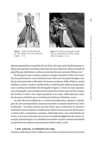abstratos geométricos no período do Art Déco. Em 1962 Andy Warhol quando realizou sua exposição com trinta e duas latas de sopa, elaborou e laborou vestido de papel Pop que simbolizava a cultura consumista dos anos sessenta (Moda, 2012). Na década de 1950 o artista, arquiteto, designer brasileiro, Flávio de Carvalho, fez performances com vestimenta/saia e blusa de seu próprio design e confecção demonstrando a liberdade do homem moderno. Hélio Oiticica, artista brasileiro, pintor, escultor e performático revolucionário influenciou gerações com a multisensorialidade dos Parangolés (Figura 2). Fruto de suas experiências o Parangolé é uma escultura móvel, expressão artística que envolve a dança dos tecidos, é vestir a arte. Capas prendem-se ao corpo, elaboradas por camadas de panos coloridos que se revelam em estruturas (Salomão, 2004). As mais diversas tendências e os vários procedimentos, suportes e abordagens da arte contemporânea, mais precisamente no mundo atual levou à insubordinação de muitos artistas em suas obras, que se afastaram de museus e instituições mais ortodoxas e tradicionais. Houve um processo de deslocação e o artista adere a programas e projetos, elaboradas para e em comunidades diversas. A arte necessita estar em evento, no sentido heidggeriano de evento, exposição, demonstração e se constituir em um abrir-se para o mundo permitindo as mais diversas análises e interpretações (Marcondes, 2002). 1.Arte, natureza, a vestimenta sem corpo O artista californiano Peter Coffin em 2013 vestiu com jeans troncos de árvores