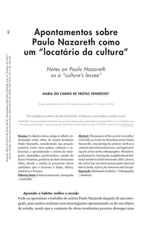 Resumo: O objetivo desse artigo é refletir criticamente sobre obras do artista brasileiro Paulo Nazareth, considerando sua atuação artística como uma prática cultural e relacional, e aproximando o artista do etnógrafo. Andarilho, performático, saindo do bairro Palmital, periferia de Belo Horizonte (MG), Brasil, o artista já percorreu vários caminhos que o levaram à Índia, África, Américas e Europa. Palavras chave: Estética relacional / etnografia / andarilho.