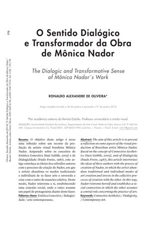 170 Oliveira, Ronaldo Alexandre de (2014) “O Sentido Dialógico e Transformador da Obra de Mônica Nador.” Revista :Estúdio, Artistas sobre Outras Obras. ISSN 1647-6158, e-ISSN 1647-7316. Vol. 5 (9): 170-178.