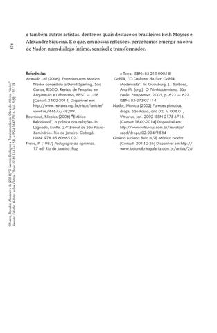 e Terra, ISBN: 85-219-0005-8 Gablik, “O Desfazer da Suzi Gablik Modernista”. In: Guinsburg, J.; Barbosa, Ana M. (org.). O Pós-Modernismo. São Paulo: Perspectiva. 2005, p. 623 — 627. ISBN: 85-273-0711-1 Nador, Monica (2002) Paredes pintadas, drops, São Paulo, ano 02, n. 004.01, Vitruvius, jan. 2002 ISSN 2175-6716. [Consult.18-02-2014] Disponível em: http://www.vitruvius.com.br/revistas/ read/drops/02.004/1584 Galeria Luciana Brito (s/d) Mõnica Nador. [Consult. 2014-2-26] Disponível em http:// www.lucianabritogaleria.com.br/artists/26