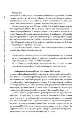 Introducción Partiendo del cuadro ventana renacentista se inicia una negación de la ficción espacial pictórica para adentrarse en la superficie de la tela, lo que se ha denominado como lo laminar de la pintura. La pintura se extiende en superficie y es en esta retórica del espesor de la pintura donde sitúa su planteamiento. El trabajo artístico de Irma Álvarez-Laviada, (I.A.-L., Gijón, Asturias, 1978), lleva ya prácticamente una década girando en torno a las cuestión del vacío y las estrategias posibles que la búsqueda incesante del mismo le permite desarrollar. Enmarcando su práctica artística en lo que denominamos estética de la negación, que ha tenido su gran desarrollo a lo largo de las vanguardias del siglo XX, despliega una serie de posibilidades creativas centradas en una retórica del vacío. Ello permite una creación de imágenes pictóricas haciendo uso de lo que se ha denominado la pintura expandida. El análisis que desarrollamos toma como metodologías dos enfoque sobre los realizamos el despliegue argumental: a) Un criterio formalista, basado en el paso de la pintura que usa el sistema de la perspectiva renacentista a la pintura laminar, plana, propia de todo el siglo XX, y con ella el salto a la pintura expandida. b) Un criterio de análisis del proceso creativo en torno al vacío, no tanto como tema sino como lugar de génesis de la propia pulsión creativa. 1. De la perspectiva como ficción a la verdad de la pintura Lejos de cualquier intencionalidad representativa o mimética, los trabajos pictóricos de I.A.-L., reconocen su punto de partida en la concepción del cuadro ventana renacentista, en el que la imagen participa y se entiende desde una concepción centrada en el ojo creador que domina el espacio de la representación y en el que el concepto de infinito, ese punto geométrico e imaginario situado al fondo de la imagen, participa o abre el espacio a un vacío que irá cobrando cada vez un mayor protagonismo a lo largo de los siglos posteriores (Navarro de Zuvillaga, 1996) En estos trabajos que presentamos, parece ponerse en tela de juicio los límites que la perspectiva ha impuesto en nuestro sistema visual, de tal manera que el concepto de encuadre, base del sistema mismo de la perspectiva, apunta a un desbordamiento, como si quisiera recuperar el espacio informe perdido. Recordemos cómo las primeras pinturas de las cavernas o la representación en las vasijas del Neolítico no se presentaban enmarcadas, sino dependientes de las protuberancias de la superficie que las albergaba y de los propios objetos soportes de las primeras imágenes (Fernández Fariña, 2010).
