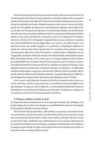 2. Proceso creativo en torno al vacío El origen de todo este interés por el vacío, hay que centrarlo, sin embargo, en el propio origen de la visión, de la imagen y su posibilidad de articular un lenguaje del mundo descifrable a nuestra mirada. En los inicios del acto pictórico, y del artístico en general, se encuentra el deseo como motor y eje de una acción. En esta retórica del vacío, hemos de ver que hay una búsqueda del encuentro mítico entre artista y absoluto (Steiner, 2004) a través de la obra, eludiendo una confrontación con lo real para adentrarse en los mundo de lo Ideal. En estos trabajos, cualquier confrontación con el objeto y la imagen parece fundir al sujeto con el objeto fuera de él mismo; nos remite en la trama creada a un lugar distinto, ideal.