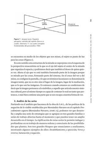 se encuentra en medio de los objetos que nos miran, el sujeto es punto de luz para las cosas (Figura 1). En este sentido esta estructura de la mirada se superpone con el esquema de la perspectiva renacentista en la que es el ojo del sujeto el centro de la mirada que organiza el espacio, y podríamos decir que también el deseo de quien quiere ver. Ahora el ojo que ve está también formando parte de la imagen porque es mirado por las cosas, formando parte del sistema. En el cruce del ver y del mirar, se configura la pantalla, o lo que en términos lacanianos se denominan la imagen tamiz, que no es otro sino el lugar de la imagen, lugar de la mediación, que es lo que son las imágenes. Es entonces cuando estamos en condiciones de decir que la imagen pertenece a lo simbólico, a aquello que articula nuestro sistema cultural, pero al mismo tiempo es capaz de contener lo real en tanto que pertenece, o más bien contiene una parte que se nos escapa a nuestra forma de ver. 3. Análisis de las series Partiendo en el análisis que hacemos de la obra de I.A-L., de las poéticas de la negación de lo visible establecidas por Hernández-Navarro en el capítulo Procedimiento ceguera (Hernández-Navarro, 2006: 73), podemos ver que desarrolla y amplía una serie de estrategias que se agrupan en tres grandes familias o series de trabajo abiertas hasta el momento y que pueden tener un amplio desarrollo en el tiempo. La tipificación de estas series le permite indagar y profundizar en su trabajo de manera ordena y consciente de las posibilidades que plantea. Son tres grandes bloques que enunciamos y analizamos, mostrando algunos ejemplos de ellos: Desdoblamiento y oposición; Verso y reverso; Saturación y negación.