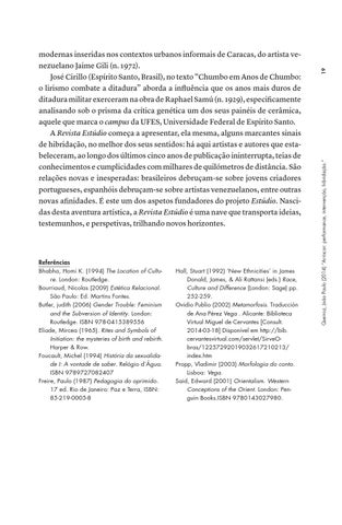 Referências Bhabha, Homi K. (1994) The Location of Culture. London: Routledge. Bourriaud, Nicolas (2009) Estética Relacional. São Paulo: Ed. Martins Fontes. Butler, judith (2006) Gender Trouble: Feminism and the Subversion of Identity. London: Routledge. ISBN 978-0415389556 Eliade, Mircea (1965). Rites and Symbols of Initiation: the mysteries of birth and rebirth. Harper & Row. Foucault, Michel (1994) História da sexualidade I: A vontade de saber. Relógio d’Água. ISBN 9789727082407 Freire, Paulo (1987) Pedagogia do oprimido. 17 ed. Rio de Janeiro: Paz e Terra, ISBN: 85-219-0005-8