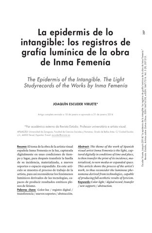 207 Escuder Viruete, Joaquín (2014) “La epidermis de lo intangible: los registros de grafía lumínica de la obra de Inma Femenía.” Revista :Estúdio, Artistas sobre Outras Obras. ISSN 1647-6158, e-ISSN 1647-7316. Vol. 5 (9): 207-213.