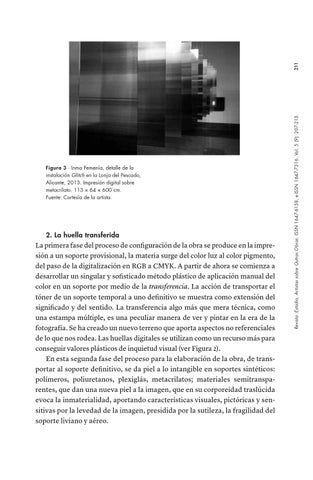 2. La huella transferida La primera fase del proceso de configuración de la obra se produce en la impresión a un soporte provisional, la materia surge del color luz al color pigmento, del paso de la digitalización en RGB a CMYK. A partir de ahora se comienza a desarrollar un singular y sofisticado método plástico de aplicación manual del color en un soporte por medio de la transferencia. La acción de transportar el tóner de un soporte temporal a uno definitivo se muestra como extensión del significado y del sentido. La transferencia algo más que mera técnica, como una estampa múltiple, es una peculiar manera de ver y pintar en la era de la fotografía. Se ha creado un nuevo terreno que aporta aspectos no referenciales de lo que nos rodea. Las huellas digitales se utilizan como un recurso más para conseguir valores plásticos de inquietud visual (ver Figura 2). En esta segunda fase del proceso para la elaboración de la obra, de transportar al soporte definitivo, se da piel a lo intangible en soportes sintéticos: polímeros, poliuretanos, plexiglás, metacrilatos; materiales semitransparentes, que dan una nueva piel a la imagen, que en su corporeidad traslúcida evoca la inmaterialidad, aportando características visuales, pictóricas y sensitivas por la levedad de la imagen, presidida por la sutileza, la fragilidad del soporte liviano y aéreo.