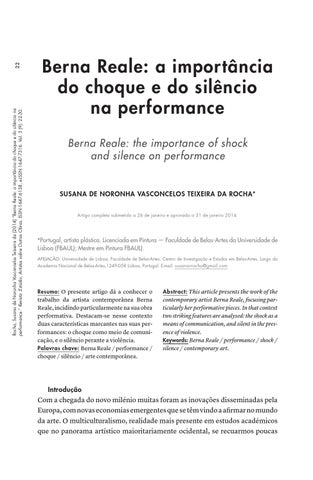 22 Rocha, Susana de Noronha Vasconcelos Teixeira da (2014) “Berna Reale: a importância do choque e do silêncio na performance.” Revista :Estúdio, Artistas sobre Outras Obras. ISSN 1647-6158, e-ISSN 1647-7316. Vol. 5 (9): 22-30.