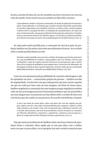 Com esse encantamento pela possibilidade de construir cada imagem e não de reproduzir em série — característica própria da gravura — Amilton nos fala de singularidade. O artista faz com que cada gravura seja uma; mesmo aquelas em que ele acaba por fazer mais de uma imagem, são feitas de forma única. Amilton singulariza a construção das suas imagens porque singulariza também cada um dos personagens/pessoas/transeuntes/anôninos que ele presentifica nas suas xilogravuras. Essa postura nos faz refletir sobre o sentido do fazer arte e de técnica que ele confere ao seu processo. De acordo com Deleuze e Guatari: A arte é um modo de reunir afetos, afeto com afeto, dor com dor, alegria com alegria, alegria com dor. Arte requer um procedimento que comporte e suporte o afeto; exige, portanto, um veículo e uma série de operações que conformem conexões com a emoção. Basicamente, uma arte de procedimento consiste em operar as sensações, em vibrá-las, distendê-las, esvaziá-las, e expandi-las, e alcançar, com esses passos, o plano de composição da obra (Deleuze; Guatari, apud Zorzo, 2007: 2).