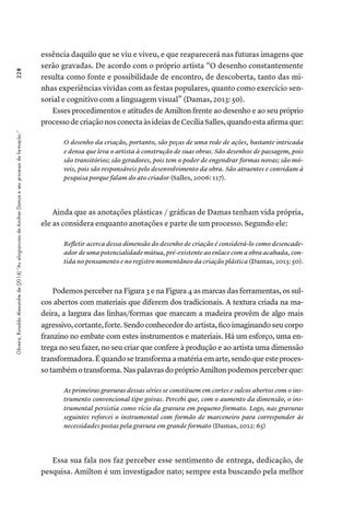 essência daquilo que se viu e viveu, e que reaparecerá nas futuras imagens que serão gravadas. De acordo com o próprio artista “O desenho constantemente resulta como fonte e possibilidade de encontro, de descoberta, tanto das minhas experiências vividas com as festas populares, quanto como exercício sensorial e cognitivo com a linguagem visual” (Damas, 2013: 50). Esses procedimentos e atitudes de Amilton frente ao desenho e ao seu próprio processo de criação nos conecta às ideias de Cecília Salles, quando esta afirma que: O desenho da criação, portanto, são peças de uma rede de ações, bastante intricada e densa que leva o artista à construção de suas obras. São desenhos de passagem, pois são transitórios; são geradores, pois tem o poder de engendrar formas novas; são móveis, pois são responsáveis pelo desenvolvimento da obra. São atraentes e convidam à pesquisa porque falam do ato criador (Salles, 2006: 117).