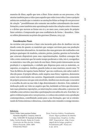 maneira de dizer, aquilo que tem a dizer. Estar atento ao seu processo, o faz atentar também para a vida e para aqueles que estão à sua volta. Como o próprio artista nos assinala que o contato e as anotações feitas ao longo do seu processo de criação “ possibilitaram não somente um melhor entendimento das manifestações, como também uma aproximação maior das relações entre o humano e o divino que movem as festas em si e, no meu caso, como parte do próprio fazer artístico. Compreendo que essa confluência de festas / desenhos / falas se reflete plenamente na práxis das gravuras (Damas, 2013: 23).