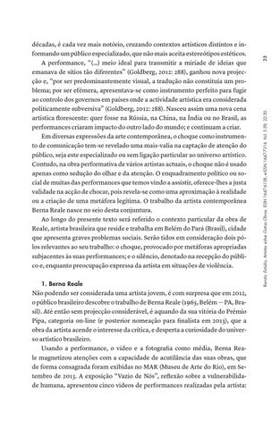 décadas, é cada vez mais notório, cruzando contextos artísticos distintos e informando um público especializado, que não mais aceita estereótipos estéticos. A performance, “(…) meio ideal para transmitir a miríade de ideias que emanava de sítios tão diferentes” (Goldberg, 2012: 288), ganhou nova projecção e, “por ser predominantemente visual, a tradução não constituía um problema; por ser efémera, apresentava-se como instrumento perfeito para fugir ao controlo dos governos em países onde a actividade artística era considerada politicamente subversiva” (Goldberg, 2012: 288). Nasceu assim uma nova cena artística florescente: quer fosse na Rússia, na China, na Índia ou no Brasil, as performances criaram impacto do outro lado do mundo; e continuam a criar. Em diversas expressões da arte contemporânea, o choque como instrumento de comunicação tem-se revelado uma mais-valia na captação de atenção do público, seja este especializado ou sem ligação particular ao universo artístico. Contudo, na obra performativa de vários artistas actuais, o choque não é usado apenas como sedução do olhar e da atenção. O enquadramento político ou social de muitas das performances que temos vindo a assistir, oferece-lhes a justa validade na acção de chocar, pois revela-se como uma aproximação à realidade ou a criação de uma metáfora legítima. O trabalho da artista contemporânea Berna Reale nasce no seio desta conjuntura. Ao longo do presente texto será referido o contexto particular da obra de Reale, artista brasileira que reside e trabalha em Belém do Pará (Brasil), cidade que apresenta graves problemas sociais. Serão tidos em consideração dois pólos relevantes ao seu trabalho: o choque, provocado por metáforas apropriadas subjacentes às suas performances; e o silêncio, denotado na recepção do público e, enquanto preocupação expressa da artista em situações de violência.