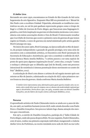 O Atelier Livre Recuando aos anos 1950, encontramos no Estado do Rio Grande do Sul certa hegemonia da arte figurativa. Enquanto Max Bill era premiado na 1a Bienal de São Paulo com a escultura Unidade Tripartida, afirmando as tendências construtivas na arte, no sul do país ganham repercussão grupos como o Grupo de Bagé e o Clube de Gravura de Porto Alegre, que buscavam uma linguagem figurativa, com forte inspiração na gravura revolucionária mexicana e em consonância com outras associações dentro e fora do Brasil. É interessante ressaltar que é no Clube de Gravura que ocorre o primeiro curso de gravura de que temos registo no Estado, o curso de gravura em metal ministrado pelo artista gaúcho Iberê Camargo em 1955. No início dos anos 1960, Iberê Camargo, na época radicado no Rio de Janeiro, de posição independente e gozando de grande prestígio, teve uma série de encontros com a comunidade artística, os Encontros com Iberê (promoção da Secretaria de Educação e Assistência), que veio a constituir o embrião do ALP. Como destaca Maria Amelia Bulhões, “o artista passou a ser uma espécie de ponto de apoio para algumas inquietações locais”, entre elas, a reação “contra o rechaço à abstração que se difundia aqui [sul do Brasil], como um processo intencional de resistência à intensa penetração desse movimento no centro do País” (Bulhões, 2012). A articulação de Iberê com alunos e artistas do sul seguiu mesmo após seu retorno ao Rio de Janeiro, culminando na criação do ALP, cujos primeiros cursos foram na área da gravura. Ainda conforme Maria Amelia Bulhões: