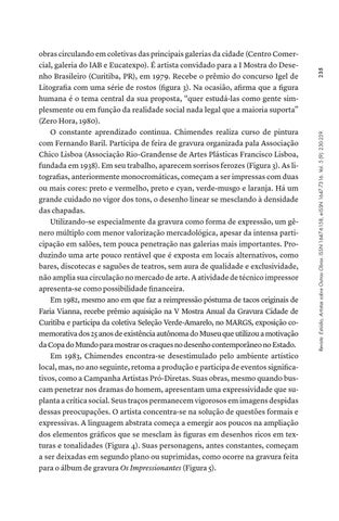 obras circulando em coletivas das principais galerias da cidade (Centro Comercial, galeria do IAB e Eucatexpo). É artista convidado para a I Mostra do Desenho Brasileiro (Curitiba, PR), em 1979. Recebe o prêmio do concurso Igel de Litografia com uma série de rostos (figura 3). Na ocasião, afirma que a figura humana é o tema central da sua proposta, “quer estudá-las como gente simplesmente ou em função da realidade social nada legal que a maioria suporta” (Zero Hora, 1980). O constante aprendizado continua. Chimendes realiza curso de pintura com Fernando Baril. Participa de feira de gravura organizada pala Associação Chico Lisboa (Associação Rio-Grandense de Artes Plásticas Francisco Lisboa, fundada em 1938). Em seu trabalho, aparecem sorrisos ferozes (Figura 3). As litografias, anteriormente monocromáticas, começam a ser impressas com duas ou mais cores: preto e vermelho, preto e cyan, verde-musgo e laranja. Há um grande cuidado no vigor dos tons, o desenho linear se mesclando à densidade das chapadas. Utilizando-se especialmente da gravura como forma de expressão, um gênero múltiplo com menor valorização mercadológica, apesar da intensa participação em salões, tem pouca penetração nas galerias mais importantes. Produzindo uma arte pouco rentável que é exposta em locais alternativos, como bares, discotecas e saguões de teatros, sem aura de qualidade e exclusividade, não amplia sua circulação no mercado de arte. A atividade de técnico impressor apresenta-se como possibilidade financeira. Em 1982, mesmo ano em que faz a reimpressão póstuma de tacos originais de Faria Vianna, recebe prêmio aquisição na V Mostra Anual da Gravura Cidade de Curitiba e participa da coletiva Seleção Verde-Amarelo, no MARGS, exposição comemorativa dos 25 anos de existência autônoma do Museu que utilizou a motivação da Copa do Mundo para mostrar os craques no desenho contemporâneo no Estado. Em 1983, Chimendes encontra-se desestimulado pelo ambiente artístico local, mas, no ano seguinte, retoma a produção e participa de eventos significativos, como a Campanha Artistas Pró-Diretas. Suas obras, mesmo quando buscam penetrar nos dramas do homem, apresentam uma expressividade que suplanta a crítica social. Seus traços permanecem vigorosos em imagens despidas dessas preocupações. O artista concentra-se na solução de questões formais e expressivas. A linguagem abstrata começa a emergir aos poucos na ampliação dos elementos gráficos que se mesclam às figuras em desenhos ricos em texturas e tonalidades (Figura 4). Suas personagens, antes constantes, começam a ser deixadas em segundo plano ou suprimidas, como ocorre na gravura feita para o álbum de gravura Os Impressionantes (Figura 5).