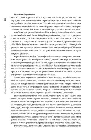 Inserção e legitimação Dentro do profícuo período abordado, Paulo Chimendes ganhou bastante destaque, sua obra recebeu muitos e importantes prêmios, mas encontrou mais espaço de nos circuitos alternativos. Vários fatores parecer ter contribuído para uma menor permeabilidade do chamado grande mercado à sua arte, desde preconceitos sociais e étnicos a instâncias de formação e escolhas formais e técnicas. Conforme nos aponta Pierre Bourdieu, as instituições universitárias constituem instâncias mais fortes de legitimação (Bourdieu, 1982: 126-8), enquanto outras instituições de ensino, como o Atelier Livre, mesmo tento sido fundamental na divulgação e no ensino da gravura no Estado, apresentam maior dificuldade de reconhecimento como instâncias qualificadoras. A inserção da produção em espaços de pequena repercussão, em instituições periféricas ou mesmo em eventos específicos da área gráfica também não contribui na legitimação da produção. Segundo Howard Becker “o ato cuja realização marca uma pessoa como artista, é uma questão de definição conceitual” (Becker, 1977: 209). Na divisão de trabalho, que ocorre na produção de arte, algumas atividades são consideradas artísticas (as que exigem o dom ou sensibilidade do artista) enquanto as demais são consideradas inferiores (as atividades manuais, executadas pelo pessoal de apoio). A atuação em serviços de apoio, como a atividade de impressor, também poderia dificultar o reconhecimento artístico. Não se pode negar que o território das artes plásticas, refletindo outros setores da sociedade brasileira, constituía-se então como templo das elites brancas, cultas e originárias das classes hegemônicas. Por vezes, o negro seria visto como uma pessoa a ser protegida, numa sutil forma de remorso residual no descendente do senhor de escravos. O apoio ao “rapaz esforçado” fica evidente no discurso do noticiário da imprensa gaúcha sobre Paulo Chimendes. Encontramos comentários como o do Correio do Povo no qual “Paulo é uma espécie de sujeito muito ocupado: de manhã, ele trabalha, cuidando da banca de revistas e jornais que seu pai tem. De tarde, estuda afiadamente no Atelier Livre da Prefeitura, e de noite, torna a estudar, mas então, o curso supletivo” (Correio do Povo, 1976). Ou seja, o redator mostra-se apiedado do menino humilde, procura torná-lo simpático aos leitores, exaltar seu empenho. Isso é uma forma de paternalismo, visto que não se indagaria um rapaz classe média e branco se ele, além de aprendiz artista, tivesse alguma ocupação “séria”. Zero Hora também adota o tom paternal: “Paulinho sabe como é importante seu trabalho nas artes, mas jamais dispensa os estudos, pois entre seus planos está seguir arquitetura” (Zero Hora, 1972). Décio Presser e Antonio Hohlfeldt, profissionais experientes, não caem nessas